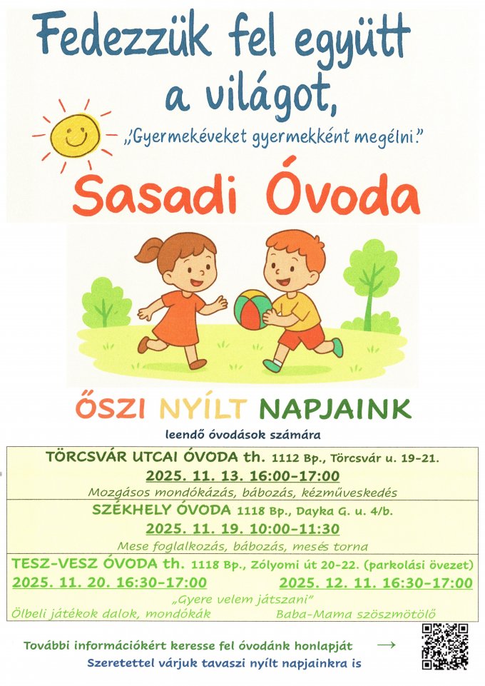 Sasadi Óvoda Székhely | 2025. október 14. Küldés emailben Szeretettel várjuk a leendő óvodásokat és szüleiket a Sasadi Óvoda őszi nyílt napjaira! Ismerkedjenek meg óvodáinkkal, pedagógusainkkal és vegyenek részt közös játékos foglalkozásokon. Megosztás a Facebookon Megosztás a Twitter-en Megosztás a Google+ on